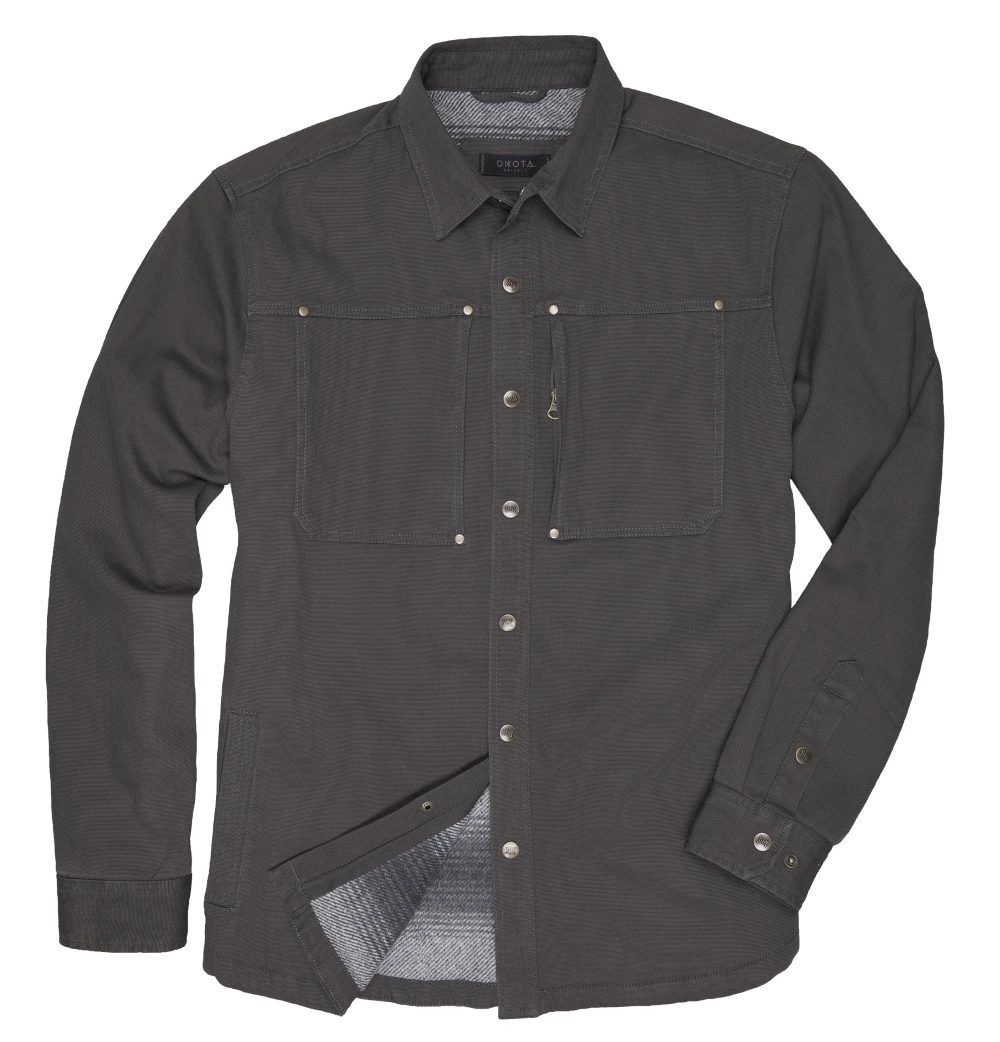 Another shirt jacket that pairs well with jeans. It appears to be rugged on the outside, but has a cozy fleece lining. It features five pockets total: two zippered chest pockets to store your phone or wallet close by, two front side pockets and one interior pocket.
